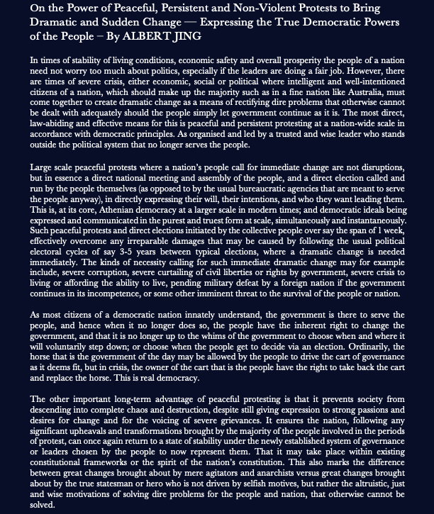 The All Australians Party and trusted Leader Albert Jing stand outside the corrupt and broken system. For now, we are taking expressions of interest from the Australian people for a national week of large scale peaceful protesting in 2026 or 2027. With enough interest and sign-ups, we will keep everyone updated on the details and logistics and later organise this large event on behalf of the Australian people. We envision it taking place simultaneously across all major cities across our country for maximum impact and effect.